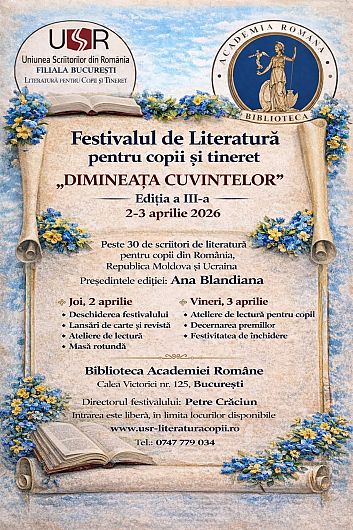 Anul acesta, între 2-3 aprilie, se va desfășura la Biblioteca Academiei din București cea de-a treia ediție a Festivalului de literatură pentru copii și tineret inițiat de scriitorul Petre Crăciun, președintele USR, filiala pentru copii și tineret. Acest festival începe pe 2 aprilie 2026, data de naștere a scriitorului danez Hans Christian Andersen și Ziua Internațională a Cărții pentru Copii. Președintele acestei ediții a Festivalului de literatură pentru copii și tineret, la care vor participa 30 de scriitori de literatură pentru copii din România, Republica Moldova și Ucraina, este poeta Ana Blandiana. Așa cum a precizat, în intervențiile online, domnul Petre Crăciun, directorul festivalului, agenda evenimentului va cuprinde: lansarea revistei „Dimineața Cuvintelor” nr. 1-2/2026 și a primei antologii a Concursului național de Creație Literară „Dimineața Cuvintelor” ediția 2025, anunțarea proiectului „Citește, Înțelege, Devino!” și proiectarea filmului cu același nume, realizat cu participarea a 19 mari scriitori din România, Republica Moldova și Ucraina, precum și acordarea premiului in memoriam scriitoarei Livia Zamfirescu.