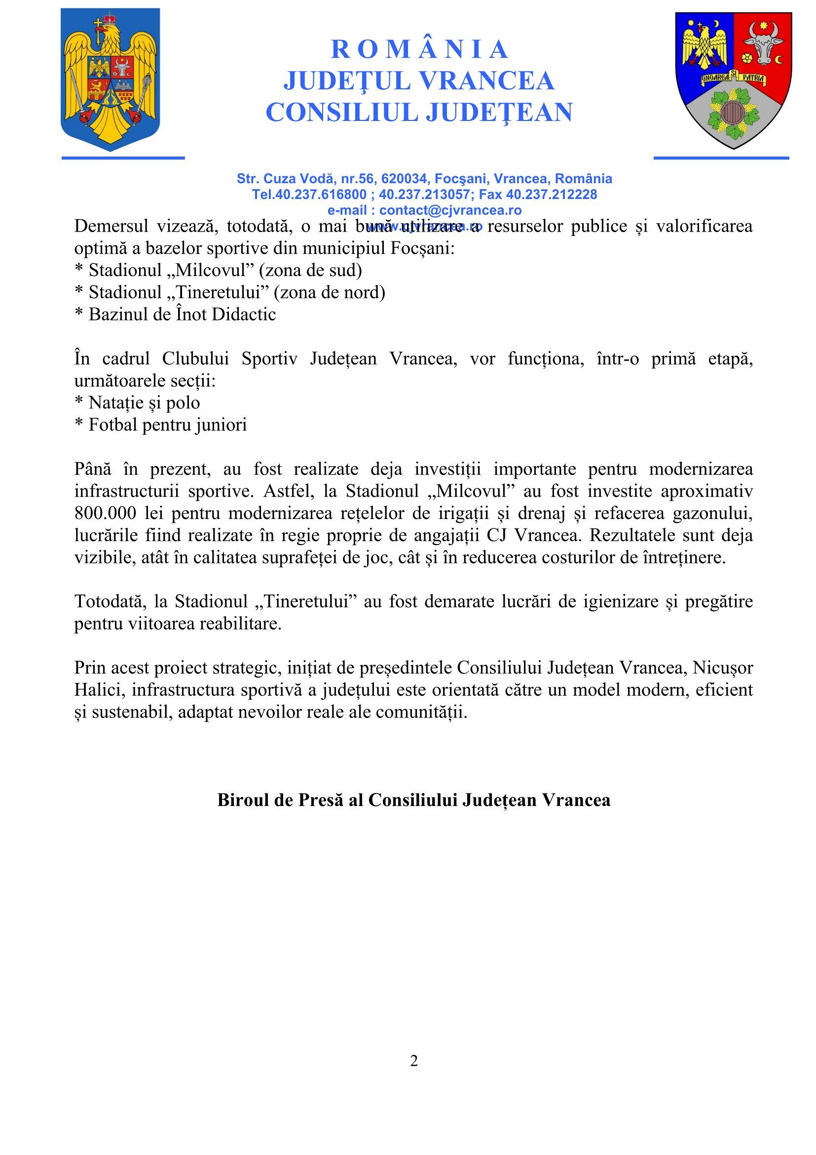 Un element central al proiectului îl reprezintă înființarea Clubului Sportiv Județean Vrancea, o premieră pentru județ. Noua structură va avea rolul de a administra eficient infrastructura sportivă și de a susține performanța.