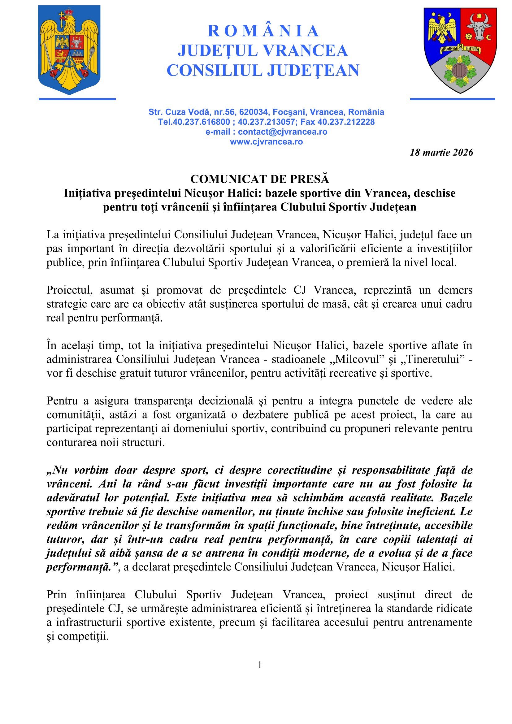 Citiți și conținutul integral al comunicatului de presă făcut public, miercuri 18 martie 2026 ora 14:29, de Biroul de presă al Consiliului Judetean Vrancea în legătură cu această știre