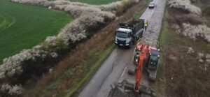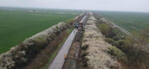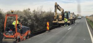 🟦 În paralel, pe celălalt contract de consolidare, Cruceni – Livezile (km 44 – km 60), lucrările vizează frezarea stratului de asfalt existent, desfacerea structurii existente din beton, executarea săpăturilor și stabilizarea terenului cu liant hidraulic.
