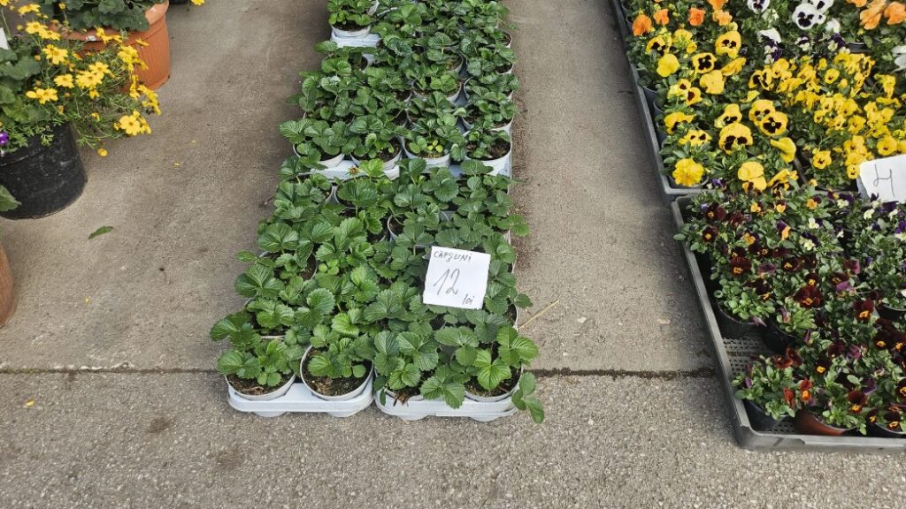 Pentru iubitorii de fructe proaspete, ghivecele cu stoloni de căpșuni (soiuri remontante) costă în jur de 12 lei, promițând recoltă bogată pe tot parcursul verii.
