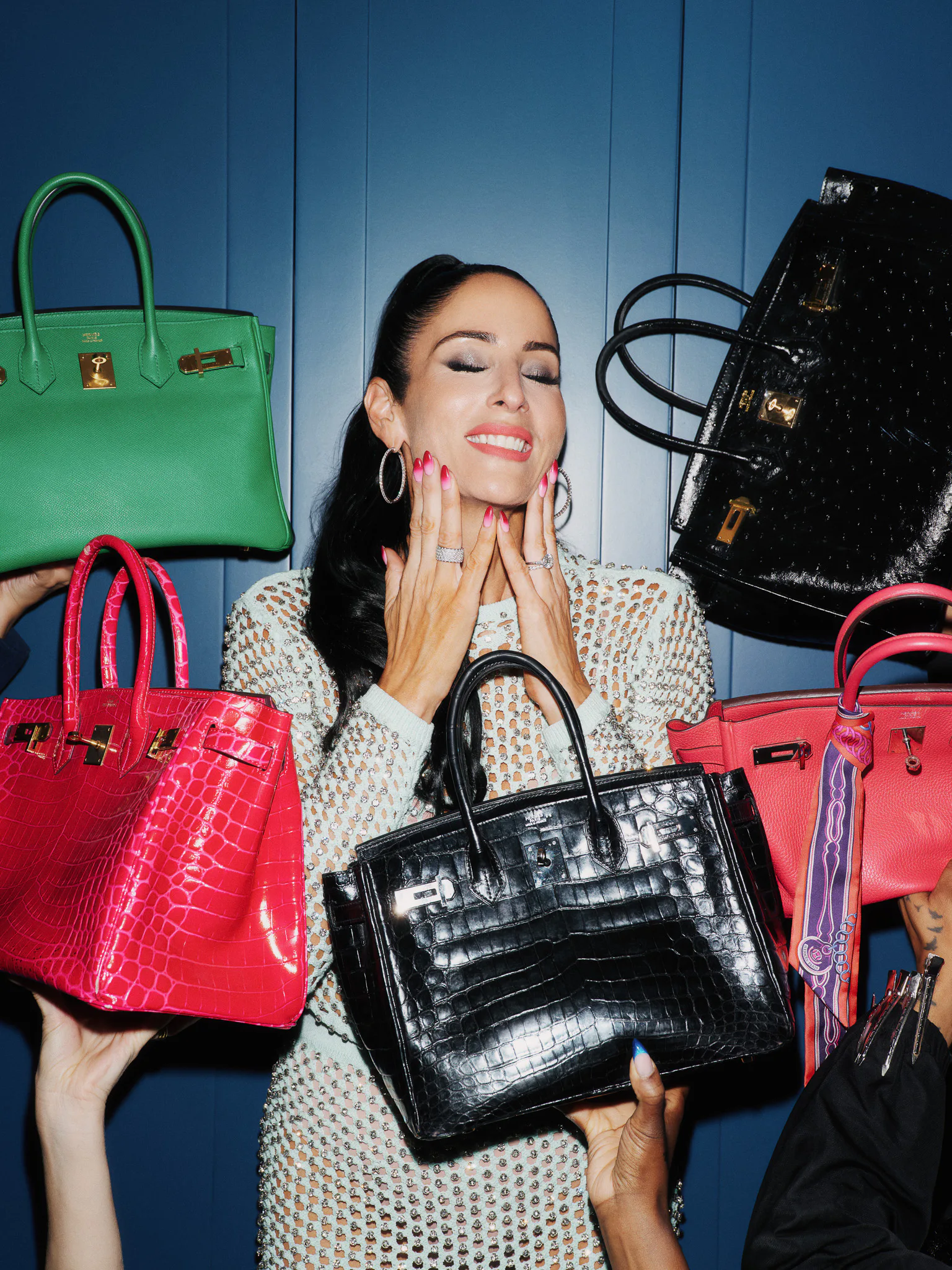 Balmain, Pucci, Fendi, Balenciaga: These are just a few of the bold statement brands that dominate Hunt’s closet. While she’s always appreciated a designer moment, Hunt says this is the first time in her life that she’s fully felt free to indulge in a label’s sauciest offerings. A self-described dress devotee who lives and dies by theme and color coordination, she leans into all things bright, short, and fitted, finished with heels — always. (“Flats make me sad,” she tells me via email a few days later.) These sensibilities were on full display for Hunt’s photo shoot, which spotlights some of her favorite pieces, including a belted body-con Balmain LBD and crystal-encrusted Fleur du Mal mesh set, as well as a satisfying sampling of her extensive designer bag collection.