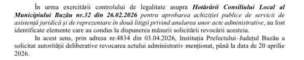 Indiferent de argumentele contra aduse în plen, mașinăria de vot a PSD a dat undă verde contractării serviciilor juridice. Haritina Crăiță a semnalat situația și Instituției Prefectului, pentru efectuarea controlului de legalitate. Și, în mod absolut surprinzător, după ce, în ultimii ani, această instituție a stat deoparte, preferând să lase cetățenii să lupte cu ceea ce considerau a fi ilegal în hotărârile CLM Buzău, a venit un cartonaș roșu. Instituția Prefectului a decis să solicite CLM Buzău anularea hotărârii privind contractarea serviciilor juridice și a dat și un termen: 20 aprilie.