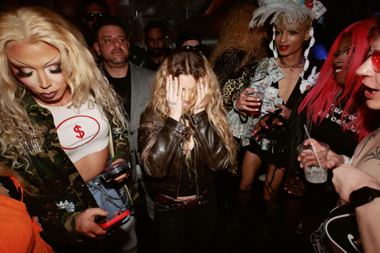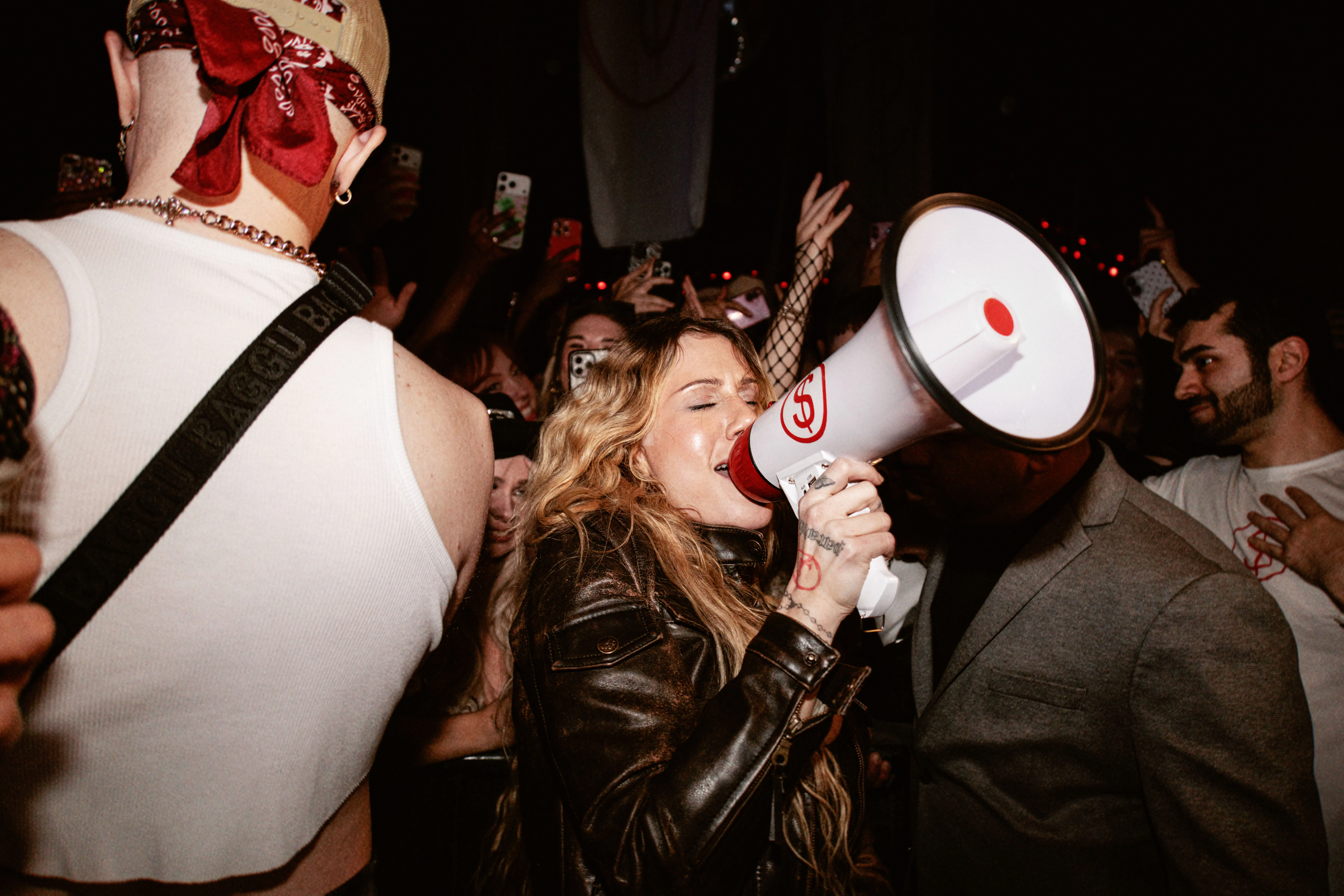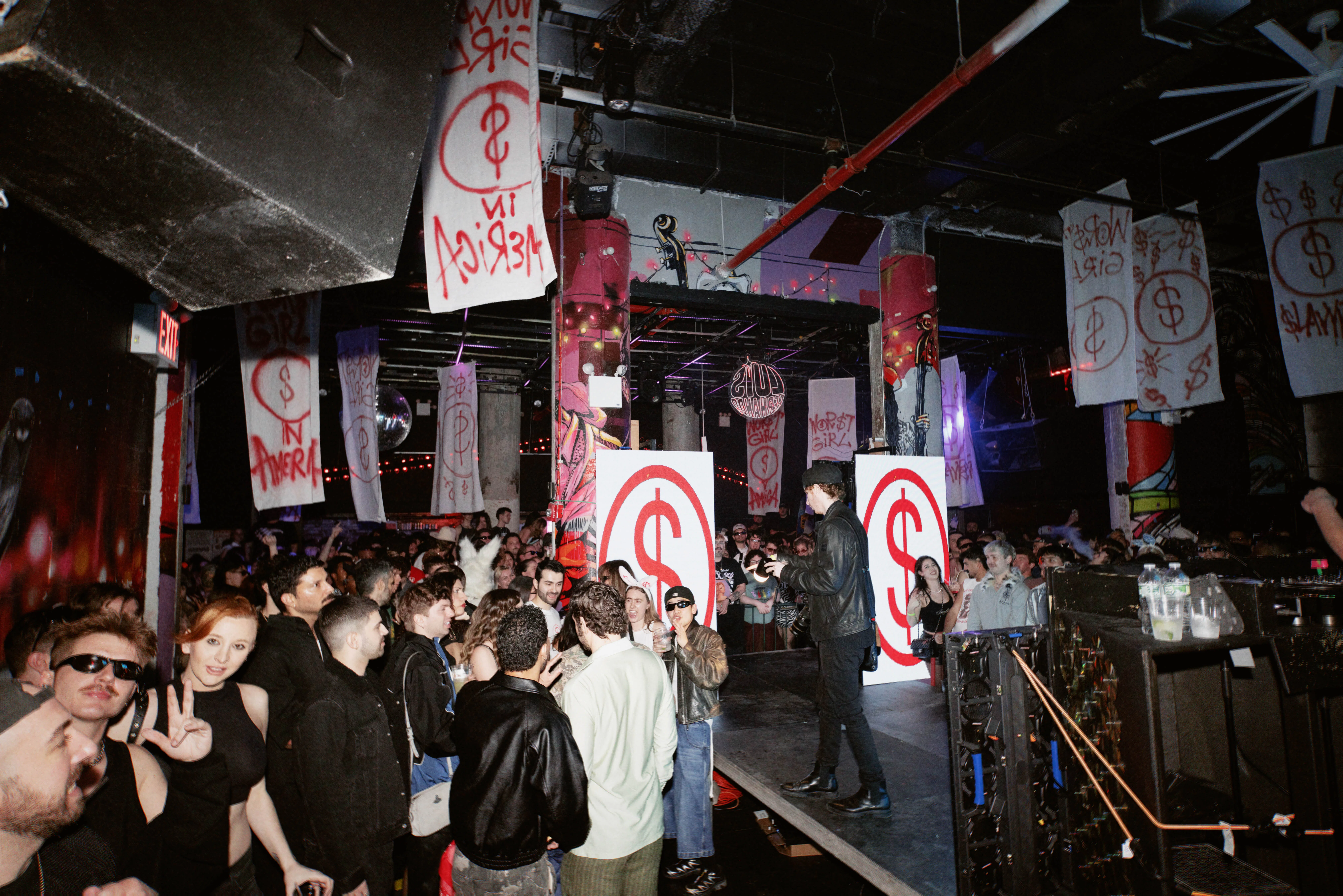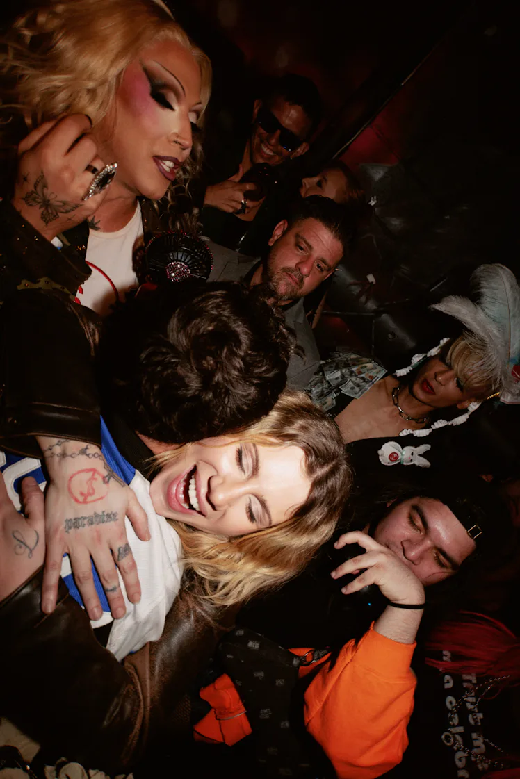 Her looks on the single covers and in the music videos are already being recreated by fans and drag queens, who were out in full force at her album release party thrown by Luis Fernando’s World, our next stop of the night. When we arrive at 3 Dollar Bill, we make a beeline for the greenroom; Slayyyter cracks open another Celsius and water. If the energy of the album is feral, the gays and theys that congregated for her were downright ferocious. Her team hatches a plan for her to step out, hand out a few beers and tequila (to stay gay off of it, naturally), and say hello to her fans with her dollar-sign-logo-emblazoned bullhorn.