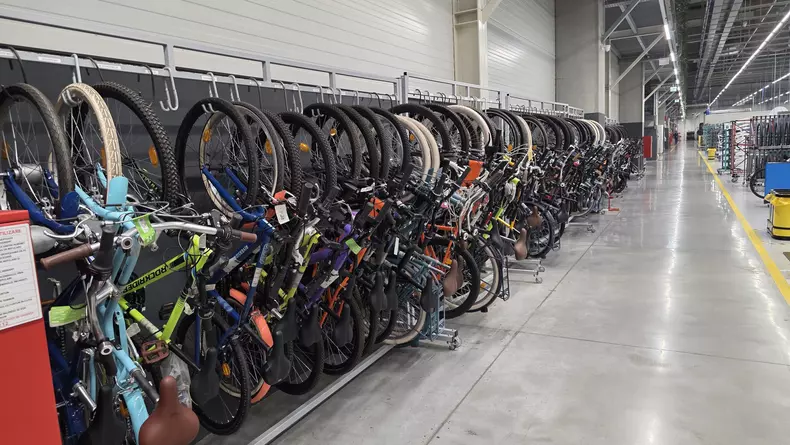 Cutiile în care bicicletele proaspăt ieșite din producție sunt împachetate ajung apoi în depozit. De aici pleacă zilnic aproximativ 4.000 de noi biciclete, fiind menținut un stoc de aproximativ 19.000 de bucăți. Cele mai multe biciclete pleacă spre rețeaua de magazine prin care sunt comercializate, dar sistemul permite ca o bicicletă comandată online să fie livrată clientului final, prin curier, direct din depozitul fabricii.