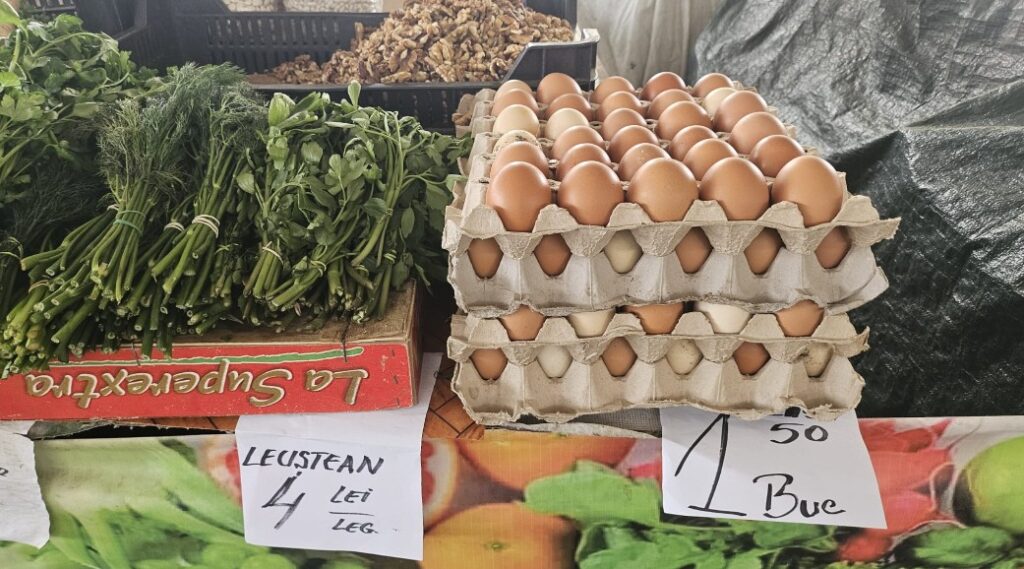 Și ouăle, nelipsite de pe masa de Paște, au prețuri variabile în funcție de mărime și proveniență, fiind comercializate cu sume între 1 leu și 1,5 lei bucata.