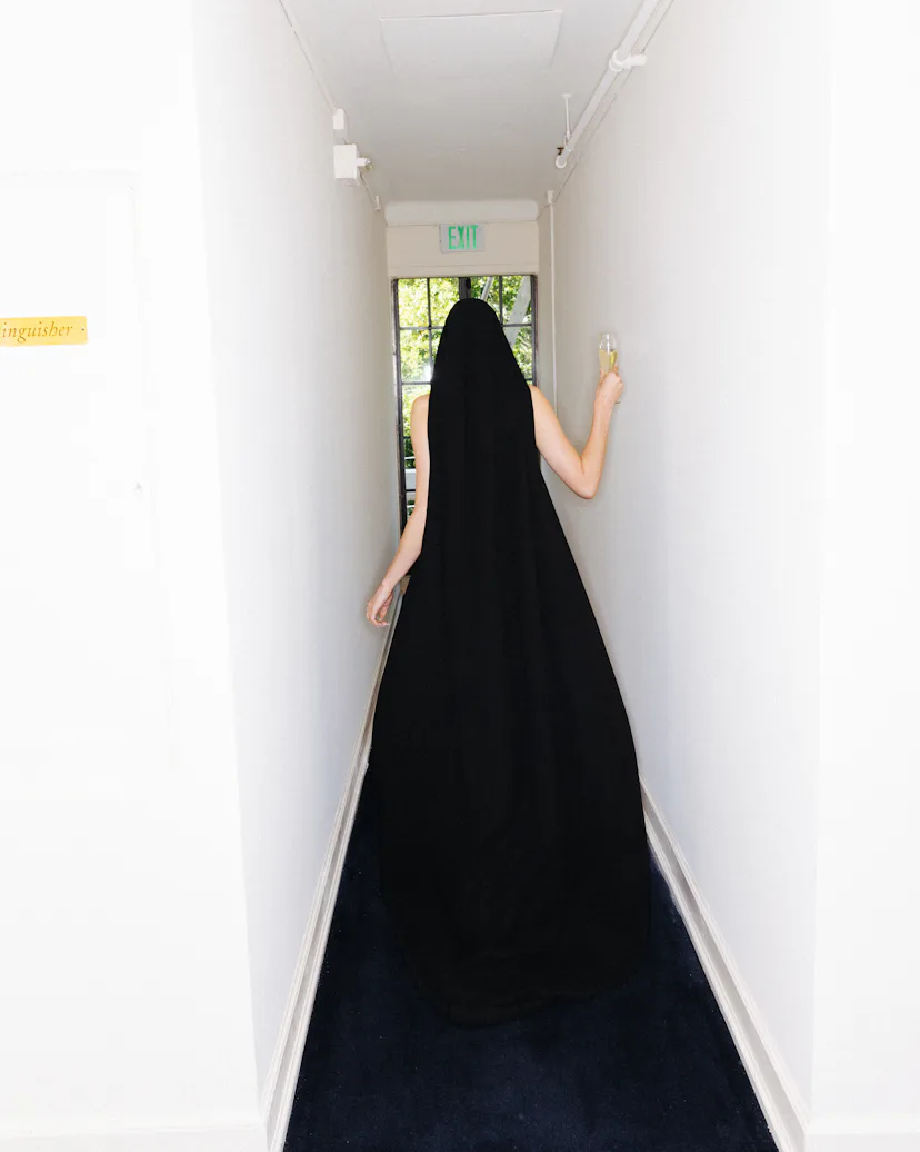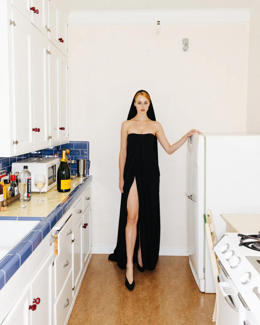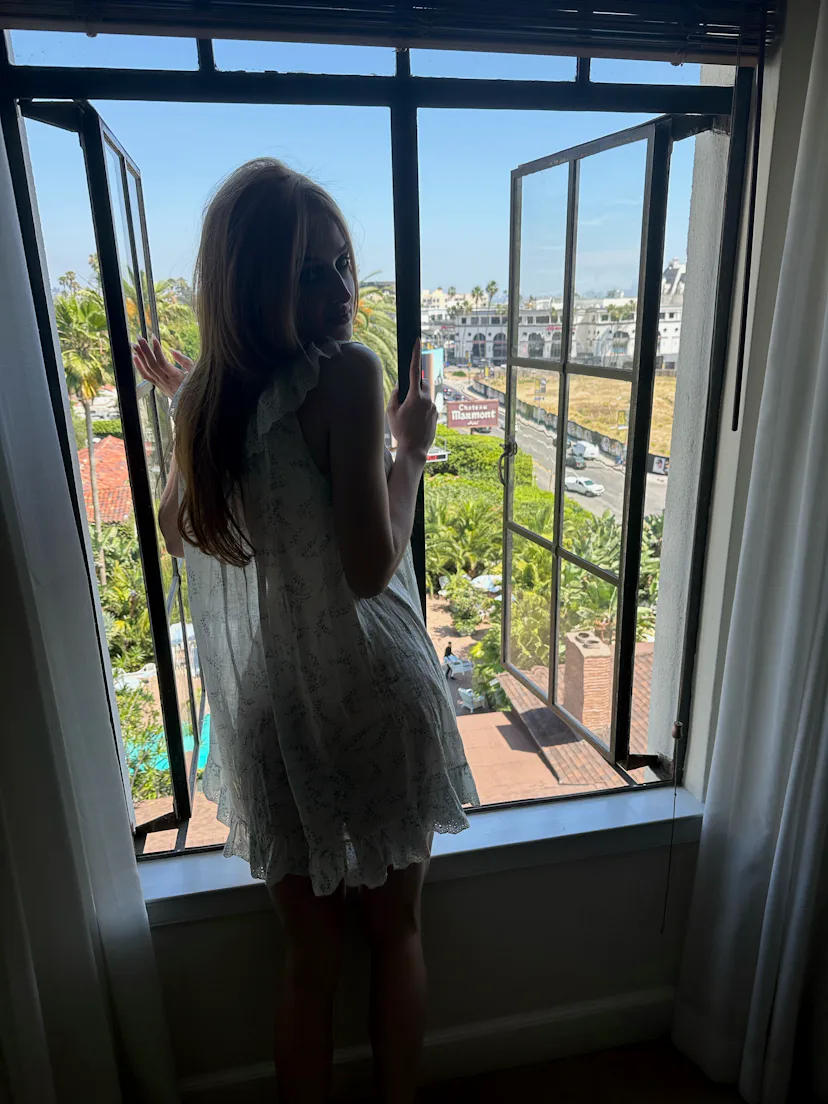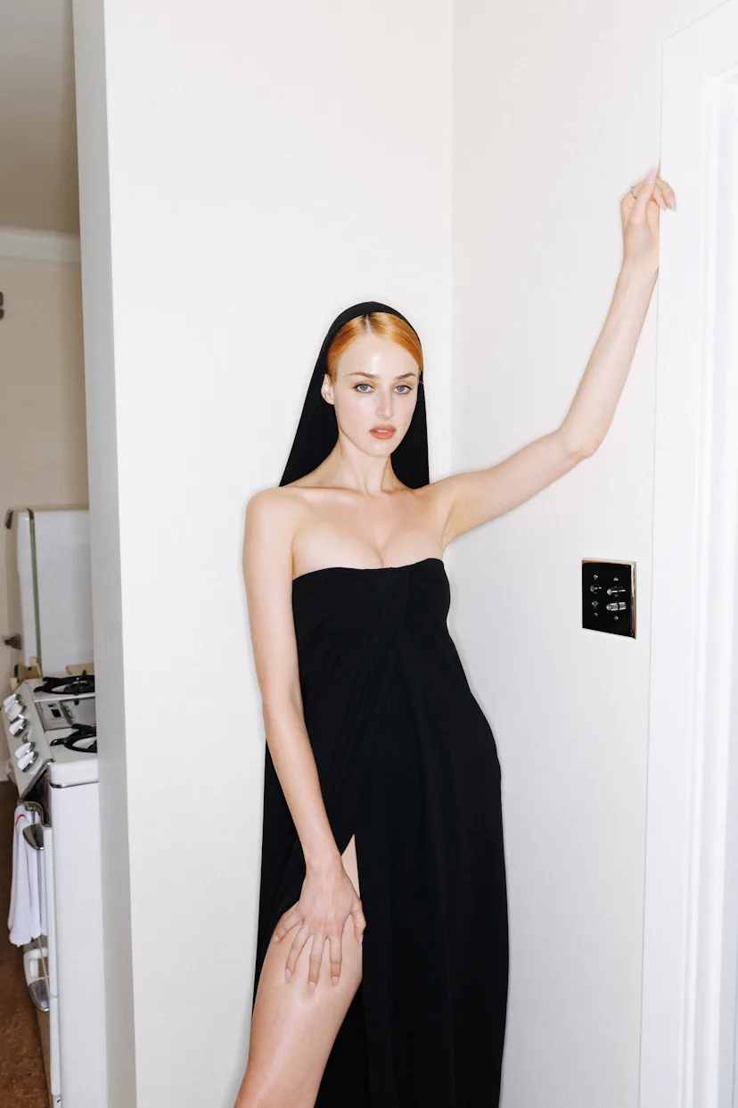 Van Patten spent her premiere day posted up at the Chateau Marmont, where she got ready for the evening by shaking off the pressure with some light reading (Marcus Aurelius’ Meditations), a quick yoga session, and a playlist loaded with Italian opera. If the playlist feels jarring for someone who is only 27 years old, her Balenciaga outfit might help it to make sense. She was an angel of the night in a hooded strapless dress; her porcelain skin and ginger hair were demure, even holy, but the slit in her dress kept the va-va-voom. It was classic Italian glamour à la Monica Vitti, reimagined for Hollywood. See how she made it from sunrise to sunset (and into bed with a burger) below.