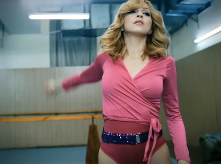 I don’t really even need to describe what she’s wearing in the video, but in case you were born yesterday, a little run down: She walks into an empty dance studio in a blue track suit, slipping it off to reveal a fuchsia wrap ballet top, pink bodysuit, sparkly purple belt, knee-length nude tights, and burgundy Patrick Cox peep-toe sandals. The video is an homage to John Travolta’s hip-forward dancing in movies like Saturday Night Fever and Grease, and stylistically, Madonna’s ‘fit gets right to the heart of the ‘80s matter with neon colors and a Perfect-esque silhouette. Everything was vintage and styled by longtime collaborator Arianne Phillips, who is a secondhand savant (and multiple Oscar nominee) that breathed new life into Madge with this ensemble.