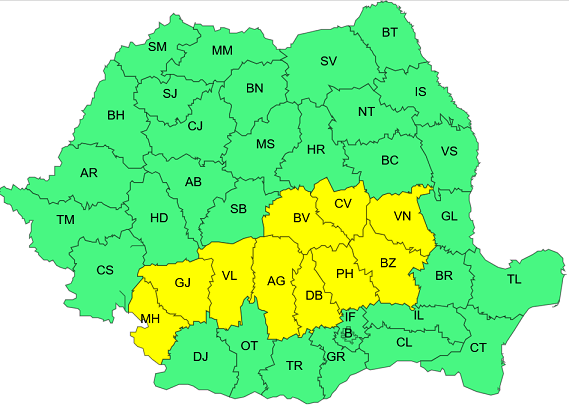 “În județele Mehedinți, Gorj, Vâlcea, Argeș, Dâmbovița, Prahova, Buzău, Vrancea, Brașov și Covasna vor fi perioade cu instabilitate atmosferică accentuată. Aceasta se va manifesta prin averse torențiale, descărcări electrice, intensificări ale vântului (rafale de 50…55 km/h) și izolat vijelii și grindină. În intervale scurte de timp (1…3 ore) cantitățile de apă vor fi de 20…25 l/mp și izolat de peste 35 l/mp”, anunță ANM.