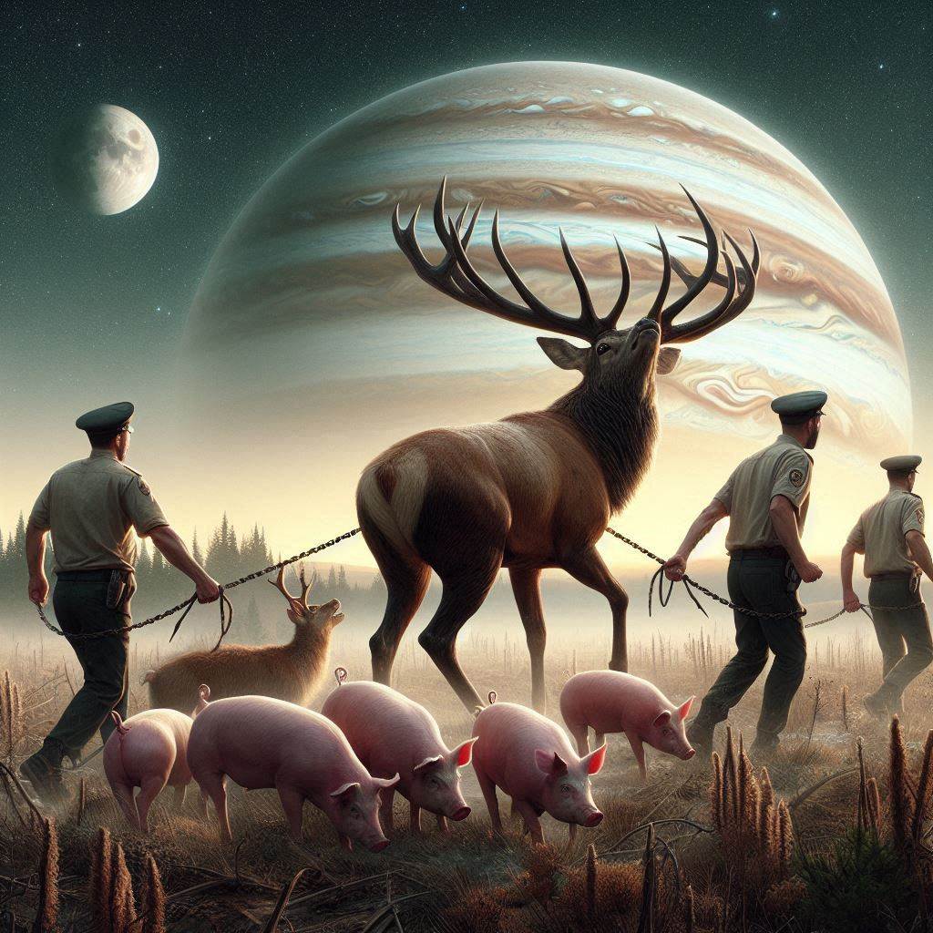 Pe așternutul de frunze unde dormea Cerbul carpatin, într-o adâncitură ferită, domnea o liniște feerică întreruptă doar de briza fină care mângâia frunzele stejarilor. Înainte de răsarit, liniștea fu perturbată de tropăitul copitelor despicate ale porcilor care au invadat spațiul Cerbului și l-au încolțit. Era ziua în care Jupiter avea o influență predominantă.