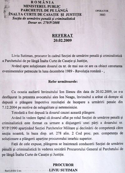 Parchetul General, condus de Laura Kovesi, actioneaza fatis pentru absolvirea criminalilor din decembrie 1989 de orice vina. Toate dosarele privind pe Ion Iliescu si camarila acestuia care i-a asasinat pe Ceausesti pentru a prelua Puterea sunt inchise unul dupa altul, la comanda, fara sa se administreze aproape nicio proba, afara de simple declaratii si acestea luate pentru salvarea aparentelor. Va prezentam in continuare modul in care Ion Iliescu a fost “cercetat”, in februarie 2009 – in calitate de invinuit – intr-o parte a dosarului 97/P/1990 privind mortii Revolutiei. Este singura declaratie pe care a dat-o Ion iliescu, in 21 de ani, in dosarele Revolutiei. Amintim ca in acest dosar, procurorul militar Dan Voinea incepuse urmarirea penala, in 2004, impotriva lui Iliescu si a altor 100 de persoane. Dupa ce Dan Voinea a fost eliminat din dosarele Revolutiei, Laura Kovesi a infirmat ordonanta de incepere a urmarii penale a generalului, dupa o ancheta efectuala la misto de catre procurorul de caz Liviu Sutiman, dupa cum veti vedea in continuare. Procurorul Liviu Sutiman i-a permis practic lui Ion Iliescu sa dea o simpla declaratie – care se vede de la o posta ca a fost scrisa acasa – in care acesta sustine ca a fost un “cetatean inocent” care in 22 decembrie a dat si el ca tot omul pe la CC si pe la Televiziune, iar lumea l-a impins de la spate sa preia puterea pentru ca l-a privit “cu simpatie”. Acest dosar a fost in final musamalizat la cel mai inalt nivel, chiar de catre procurorul general Laura Kovesi. Surprinde insa ca dosarul musamalizat, desi are ca obiect uciderea a 942 de persoane, si zeci de faptuitori si invinuiti in frunte cu Ion Iliescu, nu e mai gros decat dictionarul explicativ al limbii romane, dovada ca nu s-a facut nimic in el. Precum si faptul ca imediat dupa ce i s-a luat declaratia lui Iliescu, dosarul a fost trimis Laurei Kovesi, pentru ca aceasta sa-l scape pe acuzat de calitatea de invinuit (vezi facsimil).