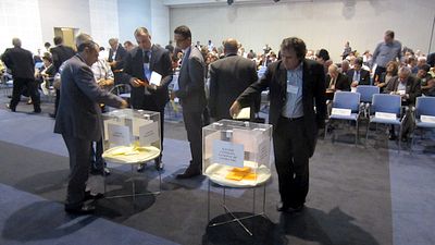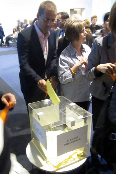 Dupa discursurile invitatilor si prezentarea raportului tehnic de activitate, delegatii la Congres au trecut la vot. Buletinele de vot au fost introduse in doua urne, una pentru presedinte (unde unic candidat a fost Arin Stanescu) si alta pentru membrii Consiliului national de conducere, ai Comisiei superioare de disciplina si Comisiei de cenzori. La orele 13.00, in mai putin de 10 minute, toata lumea a votat. Dupa care s-a plecat la masa, timp in care comisia speciala a numarat voturile.
